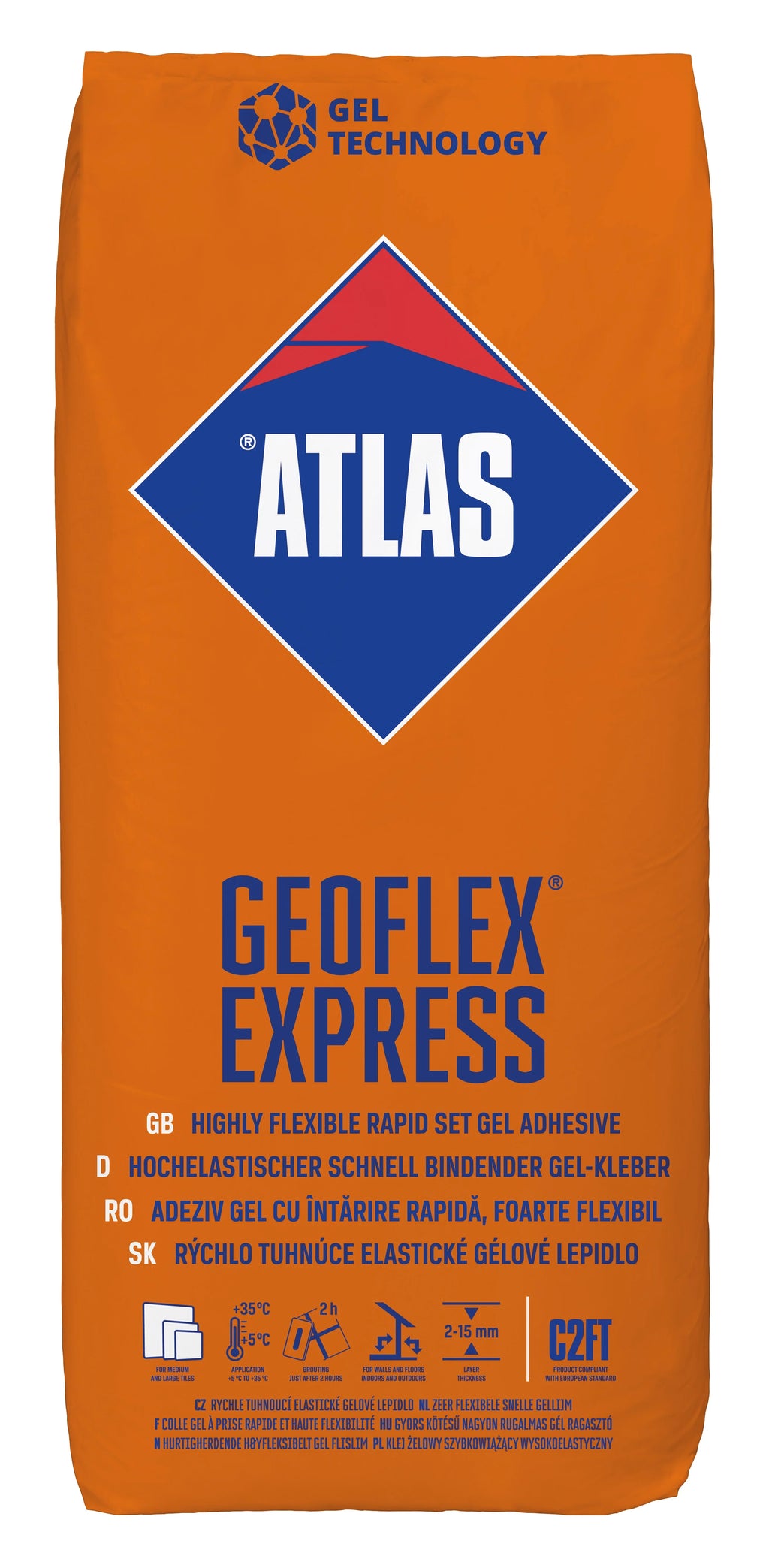 Receptura kleju ATLAS GEOFLEX EXPRESS wykorzystuje innowacyjną technologię połączenia żelu krzemianowego z szybko wiążącym cementem.