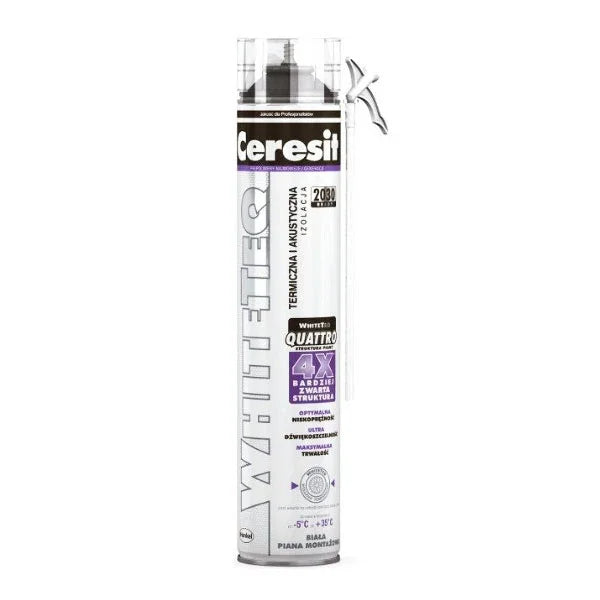 Ceresit WHITETEQ to nowa generacja technologii pianek poliuretanowych, wykorzystująca oczyszczone polimery w celu uzyskania lepszych właściwości. Pianki WHITETEQ wyróżniają się unikalną, 4-krotnie gęstszą strukturą QUATTRO-4X, która zapewnia wysoce skuteczną barierę izolacyjną i zwiększoną trwałość, odporną na długotrwałe naprężenia. WHITETEQ nie zawiera szkodliwych plastyfikatorów i wyróżnia się charakterystycznym, lodowobiałym kolorem.