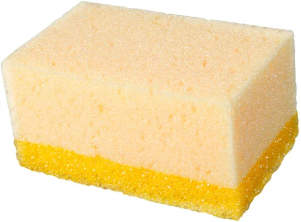 Dwustronna kostka z gąbką o małych porach i dużej chłonności wody do mycia płytek po fugowaniu oraz gąbką o dużych porach do czyszczenia płytek po fugowaniu.