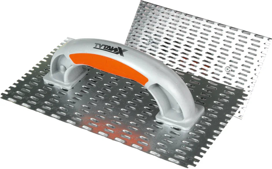 Metalowy skrobak do gipsu TytanX Posiada dużą powierzchnię ścierną wykonaną z ocynkowanej blachy, zawierającą ostre, długie i bardzo twarde zadziory. Skrobak posiada wygodną, dwukomponentową rękojeść, która zapewnia łatwą obsługę i pewny chwyt, bez ryzyka wyślizgnięcia się narzędzia. Blat roboczy skrobaka jest wymienny. W przypadku zużycia wystarczy odkręcić śruby mocujące i wymienić je na nowe.