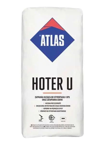 Atlas Hoter U is a professional-grade EPS basecoat adhesive designed for use in External Thermal Insulation Composite Systems (ETICS). This 2-in-1 product is engineered both for bonding EPS/XPS insulation boards and for embedding reinforcing fibreglass mesh in the basecoat render layer.