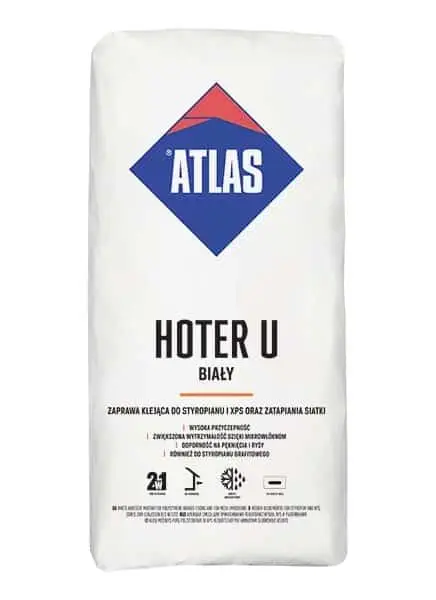 Atlas Hoter U is a professional-grade EPS basecoat adhesive designed for use in External Thermal Insulation Composite Systems (ETICS). This 2-in-1 product is engineered both for bonding EPS/XPS insulation boards and for embedding reinforcing fibreglass mesh in the basecoat render layer.