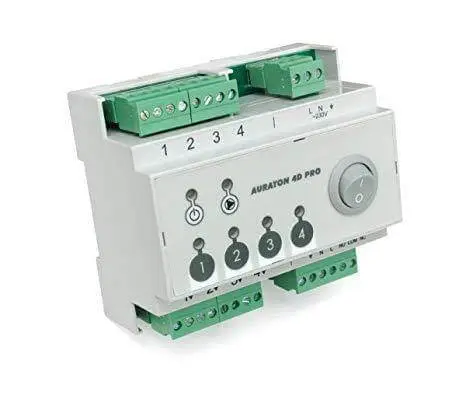 AURATON 4 ZONE CONTROLLER A strip to control floor heating actuators, intended for installation in electrical cabinets. AURATON 4D PRO works with cable temperature controllers. It enables simultaneous control of the operation of the central heating pump and of the heating device 4 heating zones. Each zone can be connected to up to 3 actuators. Easy to use and install on a DIN rail. Control of a central heating circulation pump. Control of a central heating boiler via a relay with potential-free contacts. Intended for cooperation with cable temperature controllers. In order to facilitate installation, the terminals are fitted with extendable clamps