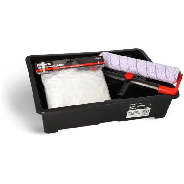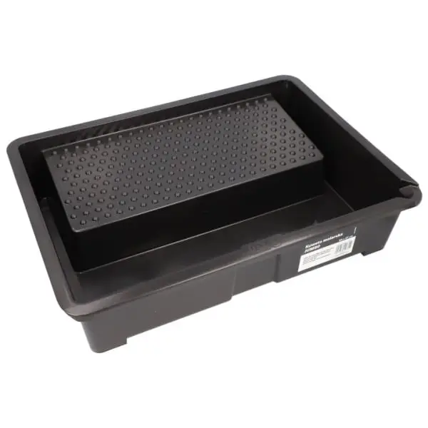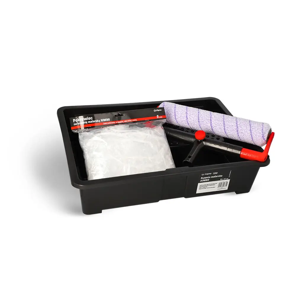 The set contains large solid paint tray with capacity of 8 litres of paint and five plastic covers.