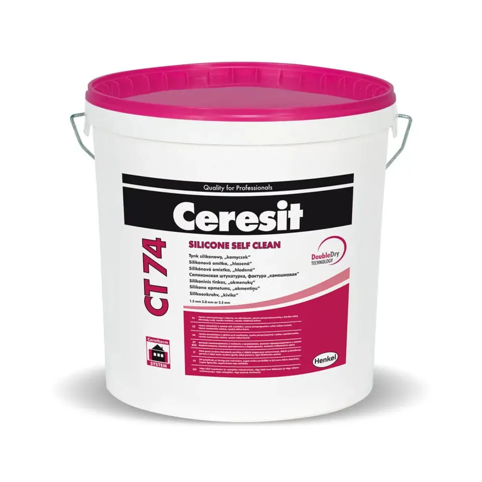 Silicone Render Ceresit CT74 is used for making thin-layer renders on concrete substrates, traditional renders, gypsum substrates and chipboards, gypsum cardboards, etc. We recommend the application of the render CT 74 as faade render within Ceresit ETICS (External Thermal Insulation Composite Systems) with the use of EPS-boards (Expanded Polystyrene boards) and mineral wool boards. Ceresit CT 74 render is recommended to be applied to the partitions where high permeability is required. CT 74 is available in a wide range of colours, but in case of intense dark colours, the material application on the facades should be limited to small areas, e.g. architectural details. This products protected against biological corrosion (fungi, mould and algae).