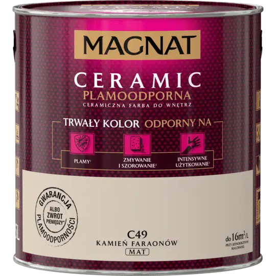 MAGNAT CERAMIC CS 3G, a 3rd generation interior ceramic paint, manufactured by taking advantage of the innovative technology – CERAMIC SYSTEM, based on ceramic components and top-quality resins and pigments. As a result of this unique formula MAGNAT paint features extraordinary resistance to wet scrubbing and multiple washing and prevents the paint coat from absorbing dirt and ‘difficult’ residues, as well as is resistant to disinfectants.